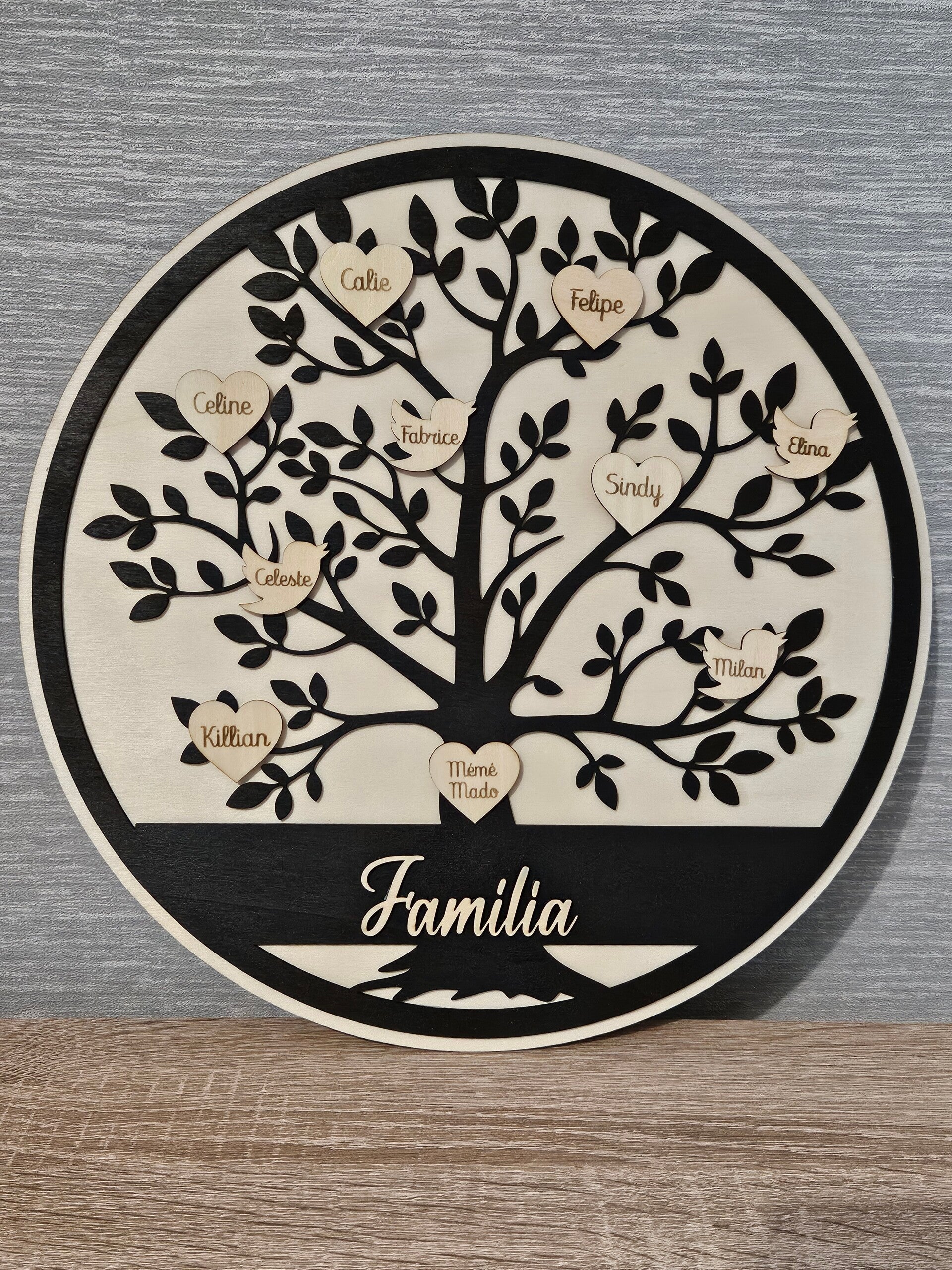 Personnalisable avec les prénoms de votre choix ( humains et/ou animaux). La phrase "notre jolie famille" peux etre aussi modifiable si vous le souhaitez.